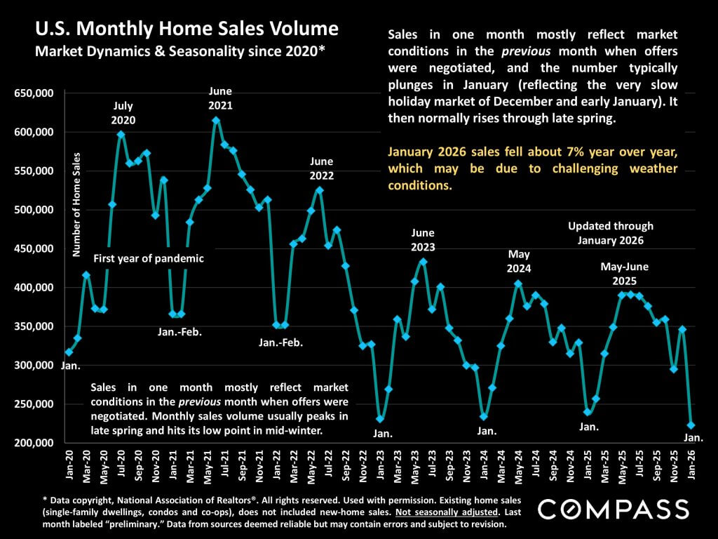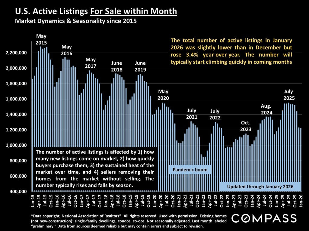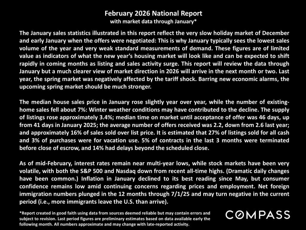 National and regional statistics are generalities, essentially summaries generated by thousands of unique, individual listings and sales occurring across different market segments. They are best seen not as precise measurements, but as broad, comparative indicators with reasonable margins of error. Anomalous fluctuations in statistics are not uncommon, and last period data should be considered preliminary estimates which may be revised in future updates. Different analytics programs sometimes define standard statistics – such as “active listings,” “days on market,” and “months supply of inventory” – differently: What is most meaningful are not specific numeric calculations but the trends they illustrate. Data from sources deemed reliable, but may contain errors, and subject to revision. All numbers to be considered approximate, and how these analyses apply to any particular property is unknown without a specific comparative market analysis.