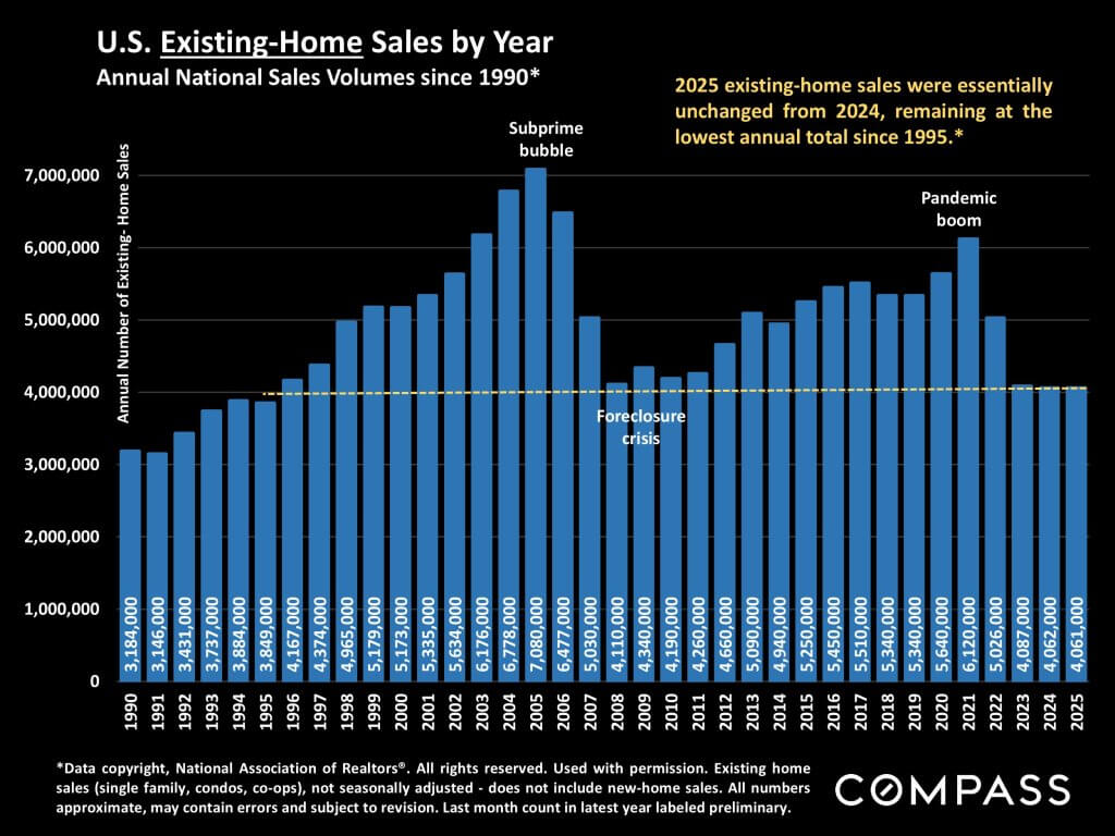 December 2025 saw a large surge in sales over November, which is not the typical seasonal trend and is a very positive indicator moving into 2026. Looking at annual sales volumes in the second chart below, 2025’s number was essentially unchanged from 2024, at a historically extremely low level of sales. We expect a rebound to occur this year.