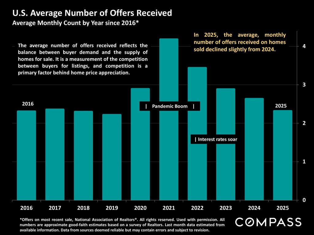 The level of competition for listings between buyers also declined, as measured by the average number of offers received on homes sold.