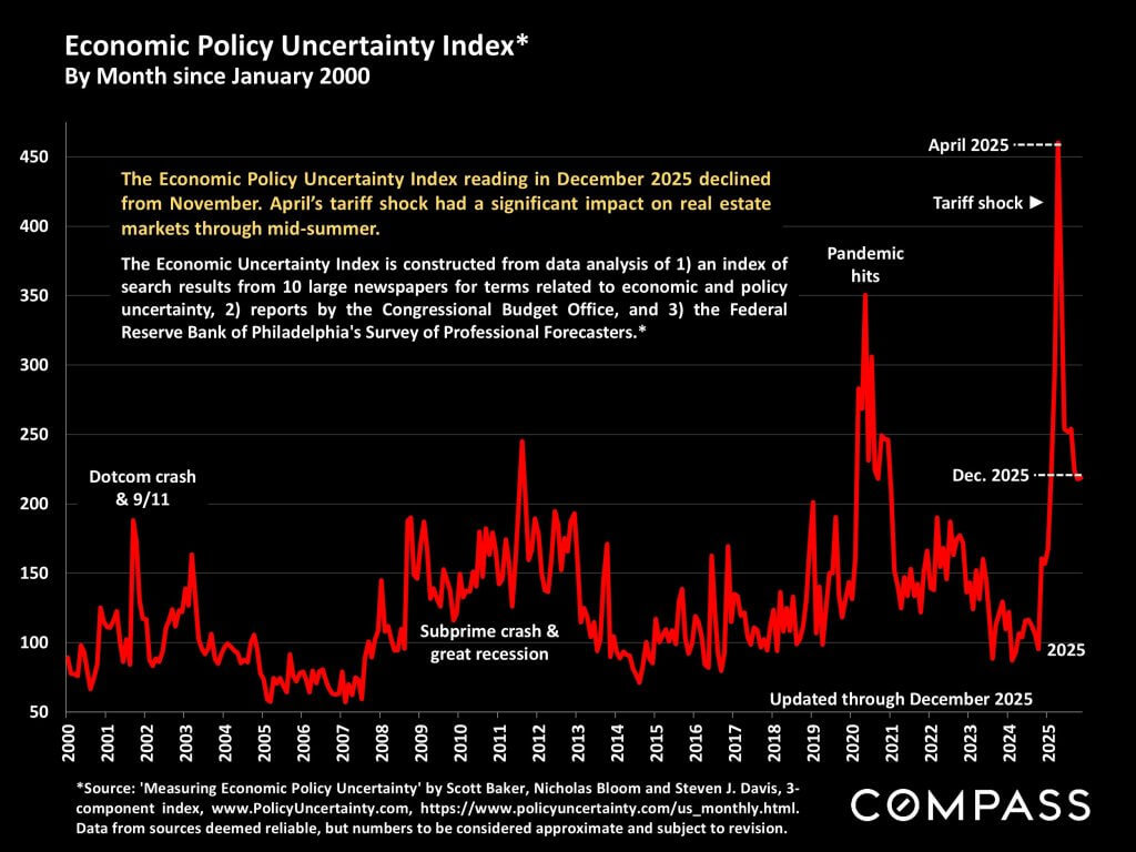 The Economic Policy Uncertainty Index below illustrates the political and economic volatility that erupted last spring, which slowed the real estate market considerably. The impact also shows up in the stock market chart above.