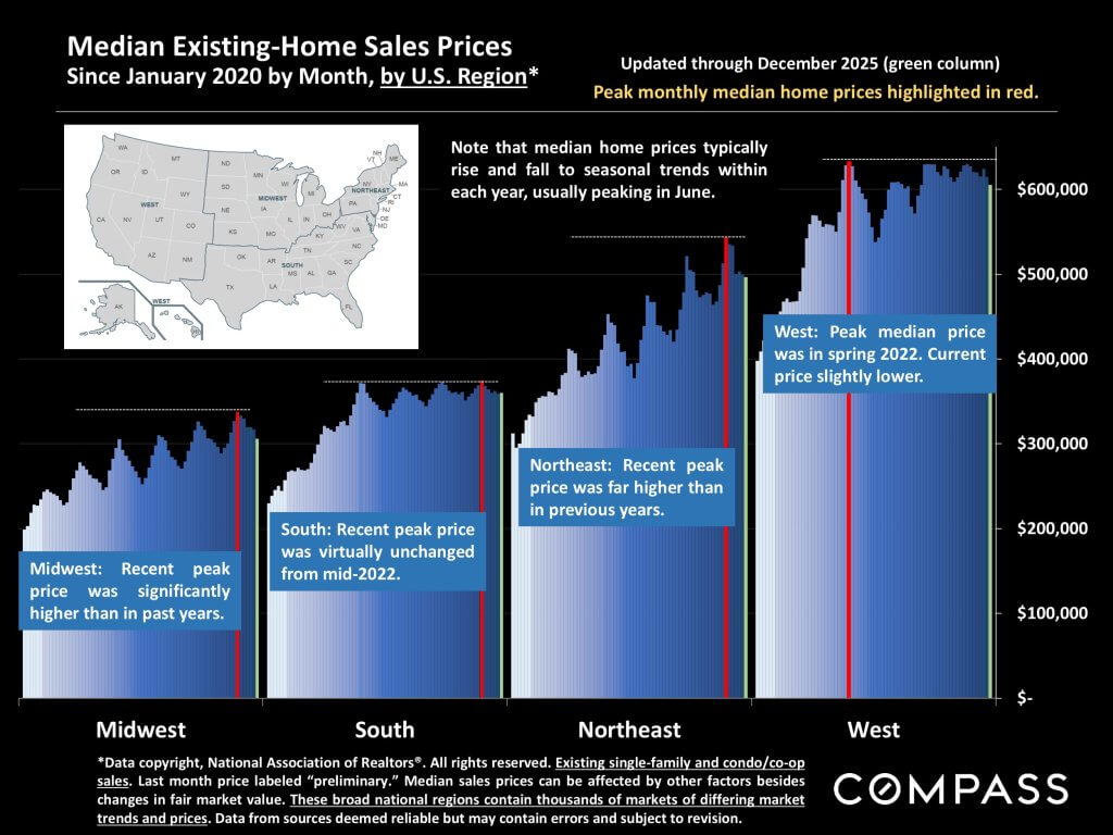 These next 2 charts look at regional median home sales prices on a monthly basis since January 2020, right before the pandemic struck, and then annual appreciation of regional home prices since 1990. The ups and downs within the calendar years on the first chart mostly reflect the effects of market seasonality.
