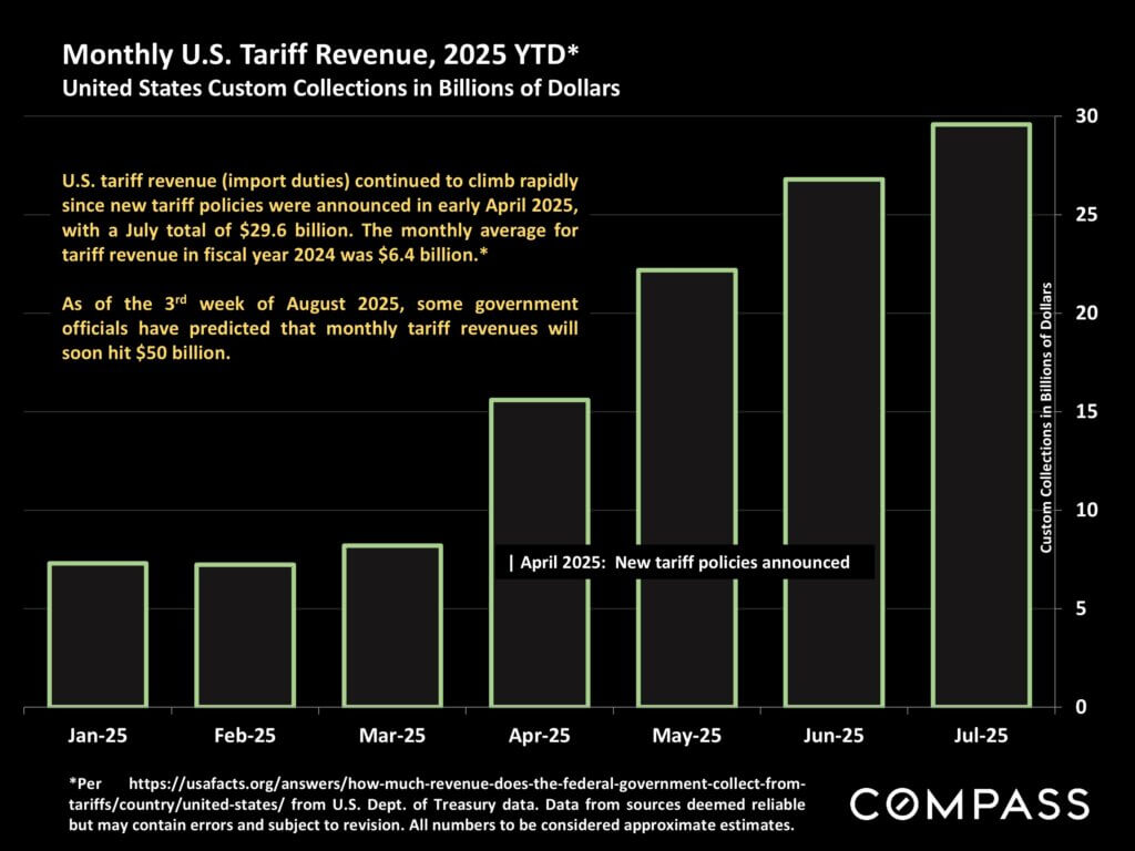 Since tariffs are much in the news, the next chart illustrates the change in revenue accruing to the federal government due to policy changes since April – possibly to an annual rate of over $600 billion per year since custom collections are expected to increase further. As far as the housing market is concerned, the big issue is whether – and, if so, how much – tariffs may affect inflation and interest rates.