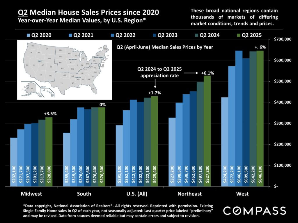 The chart below reviews national, year-over-year Q2 appreciation going back 1 to 35 years. After 4 years of furious price gains after the pandemic hit, the rate slowed dramatically in the past year. Note that this chart tracks appreciation of the full median purchase price, but buyers who financed their purchases saw much higher appreciation of their cash investments (i.e. down-payment and closing costs). And there are often substantial tax benefits. Over the longer term, homeownership has usually had enormous positive effects on household wealth. The next chart breaks down Q2 median home price changes since 2020, and Q2 2024 to Q2 2025 appreciation rates, for the 4 broad regions defined by the National Association of Realtors. The south region generally – with some of the hottest post-pandemic markets – had virtually no appreciation in the past year, while the northeast continued to appreciate rapidly.