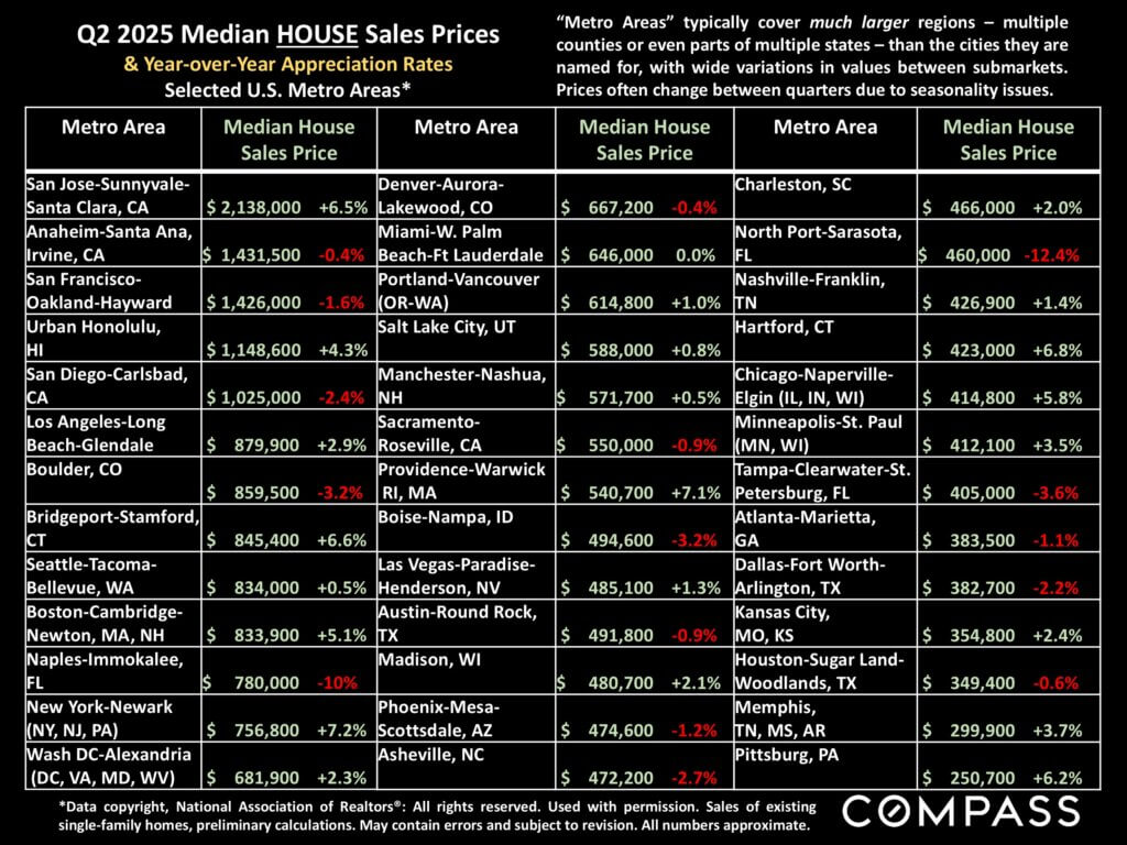 Below is a selection of major “metro-area” median house prices and year-over-year appreciation rates. Some of the markets that saw the highest demand 2020 to 2024 – including many in Florida and Texas – have seen price declines in the last year. Many factors are at play including overbuilding of new homes, soaring insurance rates, changes in immigration and tariff policies, and simply that markets that get the most overheated often see the larger reaction when conditions cool. On the other hand, as mentioned earlier, many northeast metros continued to see considerable increases in median home prices.
