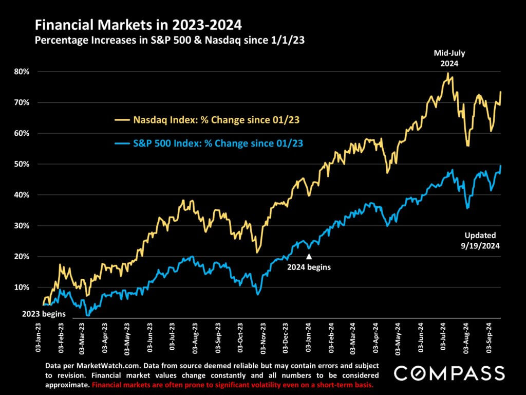 Since mid-July, stock markets have seen some dramatic volatility, but as of 9/19/24, the S&P 500 and Nasdaq were both way up year-to-date, and the S&P and the Dow (not illustrated below) hit new all-time highs.