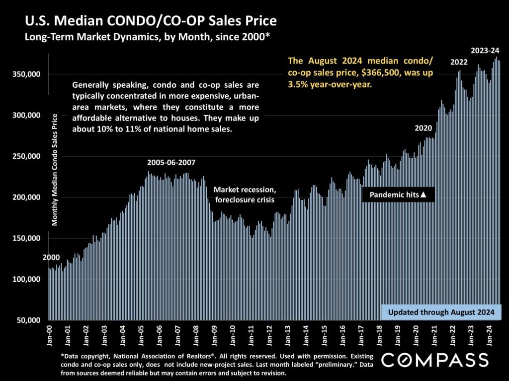 The U.S. median condo/co-op sales price since 2000: August was slightly down from the recent high in June 2024.