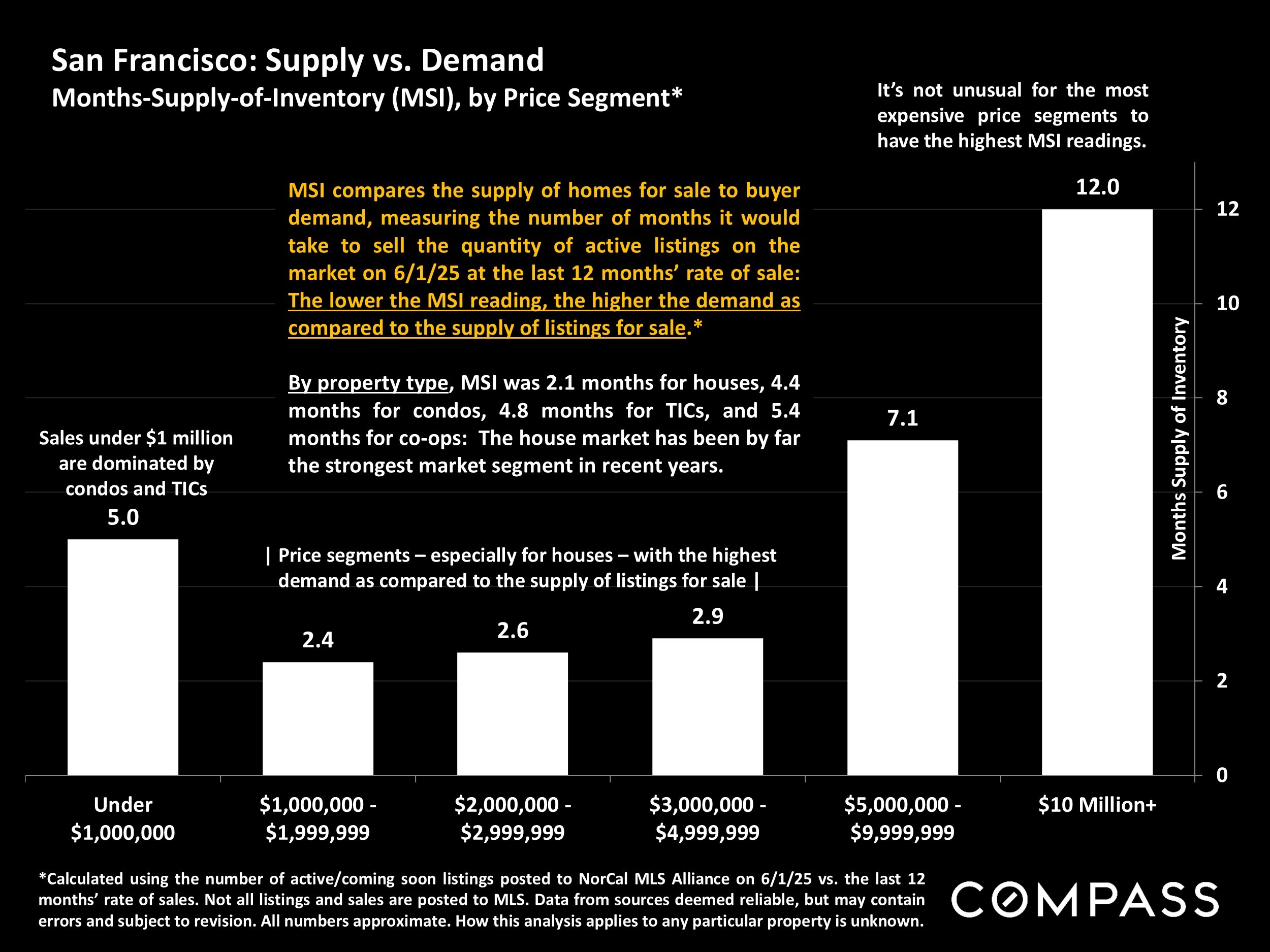 Statistics are generalities, essentially summaries of widely disparate data generated by dozens, hundreds or thousands of unique, individual sales occurring within different time periods. They are best seen not as precise measurements, but as broad, comparative indicators, with reasonable margins of error. Anomalous fluctuations in statistics are not uncommon, especially in smaller, expensive market segments. Last period data should be considered estimates that may change with late-reported data. Different analytics programs sometimes define statistics – such as “active listings,” “days on market,” and “months supply of inventory” – differently: what is most meaningful are not specific calculations but the trends they illustrate. Most listing and sales data derives from the local or regional multi-listing service (MLS) of the area specified in the analysis, but not all listings or sales are reported to MLS and these won’t be reflected in the data. “Homes” signifies real-property, single-household housing units: houses, condos, co-ops, townhouses, duets and TICs (but not mobile homes), as applicable to each market. City/town names refer specifically to the named cities and towns, or their MLS areas, unless otherwise delineated. Multi­county metro areas will be specified as such. Data from sources deemed reliable, but may contain errors and subject to revision. All numbers to be considered approximate.